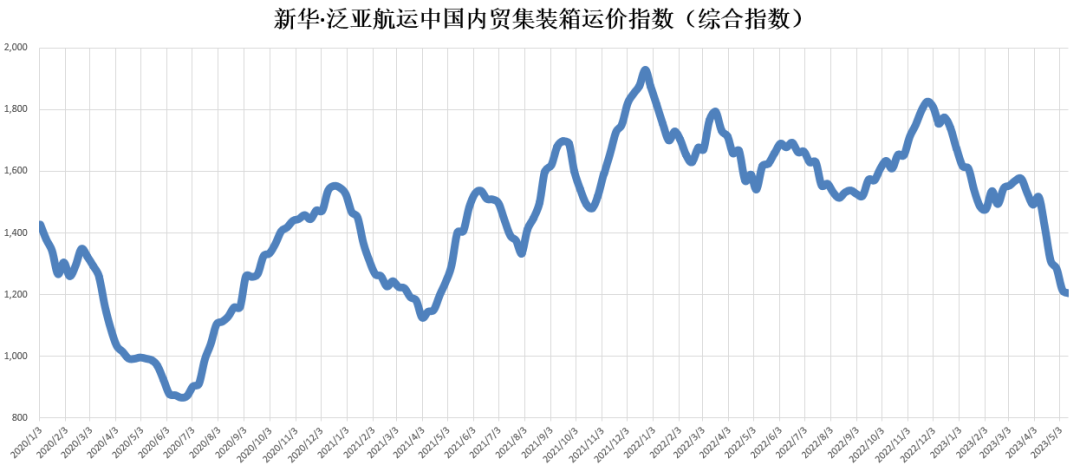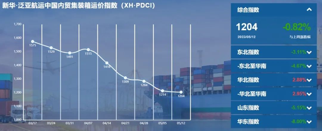 核心提示:本期报告(2023.5.6-5.12)新华·泛亚航运中国内贸集装箱运价指数报1204点,较上期(2023.4.29-5.5)环比下降10点,降幅0.82%;同比下跌412点,降幅25.50%;6只区域子指数两涨四跌,4只流向指数一涨三跌。